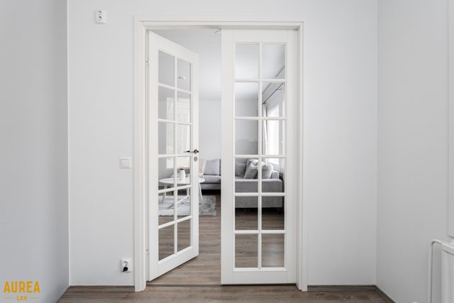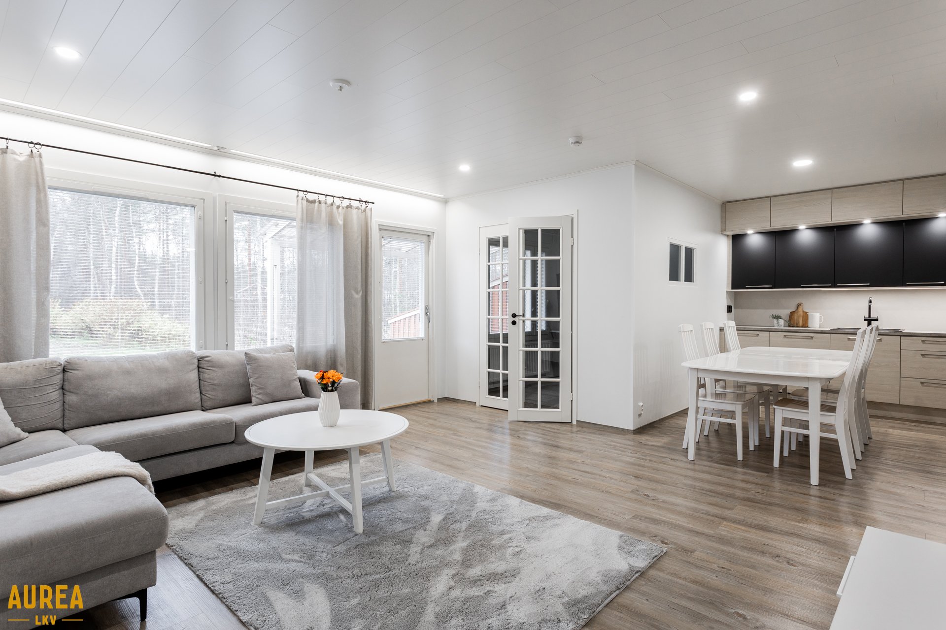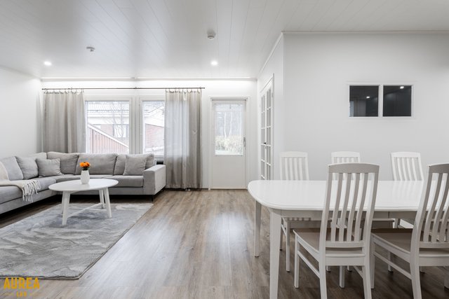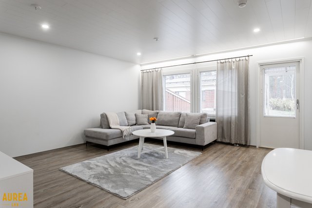 - Tilava olohuone, josta käynti takapihan terassille. Seinät: maali, lattia: vinyylikorkki, katto: mdf.