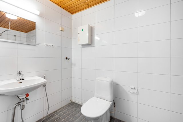 - WC-istuin, suihku, pesukoneliitäntä, allaskaappi, ja pesuallas