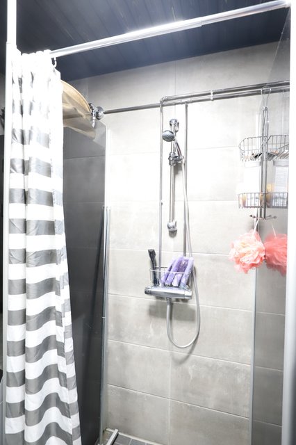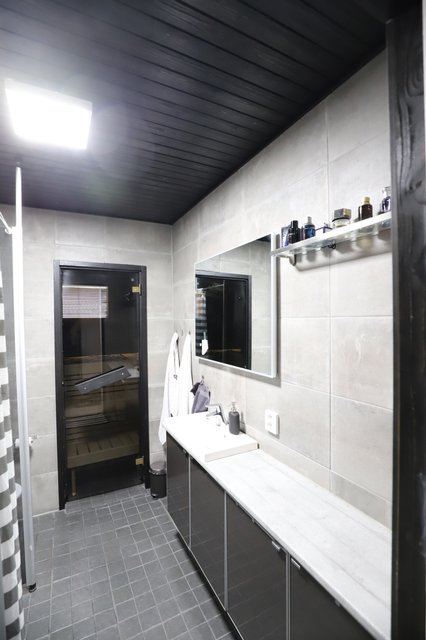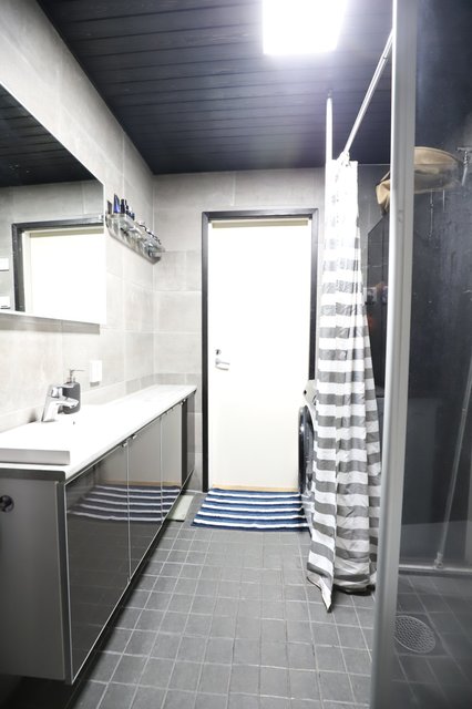 - Suihku, wc-istuin, pesukoneliitäntä, lattialämmitys, peilikaappi, suihkuseinä, allaskaappi, pesuallas, peili, ja bidee-suihku