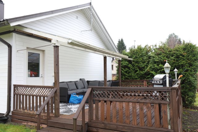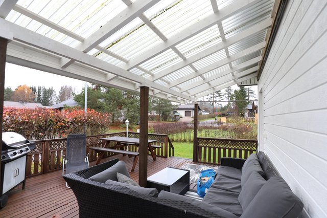 Kylpyhuone ja sauna on uusittu kokonaan vuonna 2021, ja saunassa on ikkuna, joka tuo luonnonvaloa ja lisää rentouttavaa tunnelmaa. Puolittain katettu terassi avautuu ilta-aurinkoon, ja tarjoaa ihanteellisen paikan nauttia ulkoilmasta.