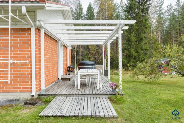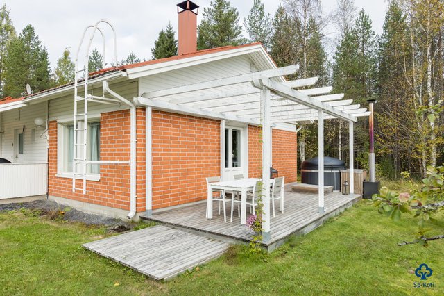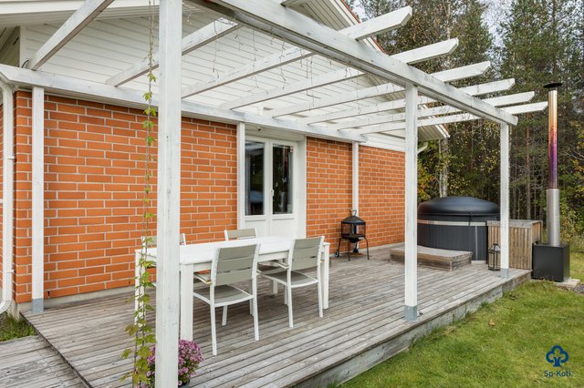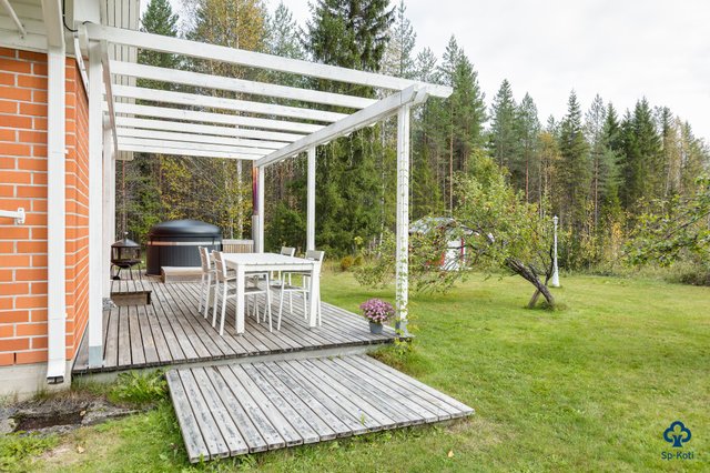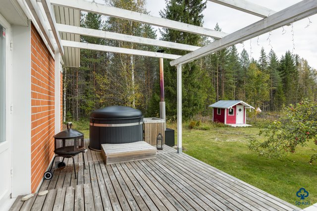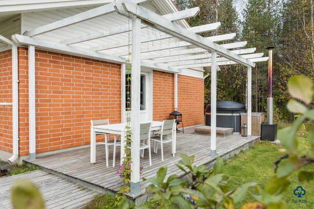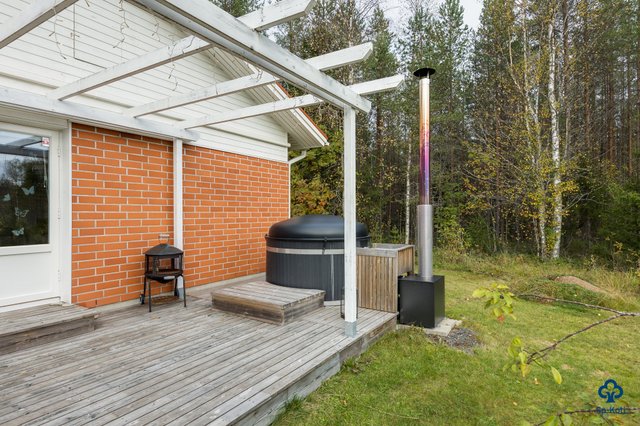 - Terassilla pergola ja puulämmitteinen kotimainen Kirami kylpytynnyri.