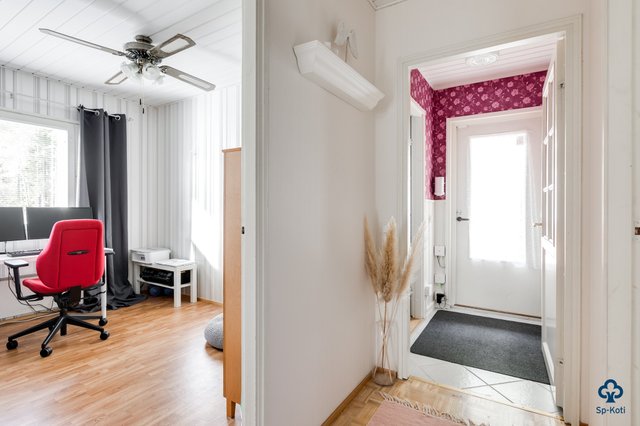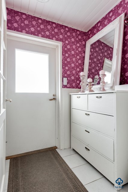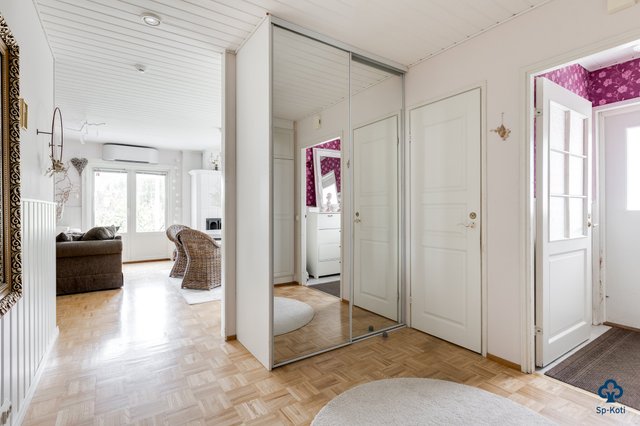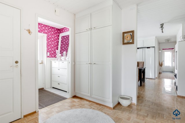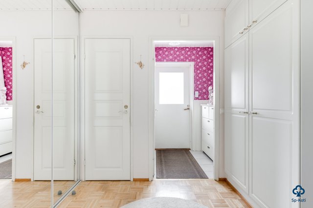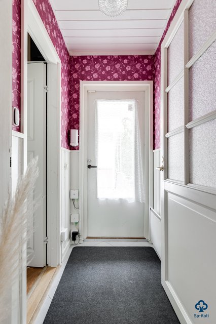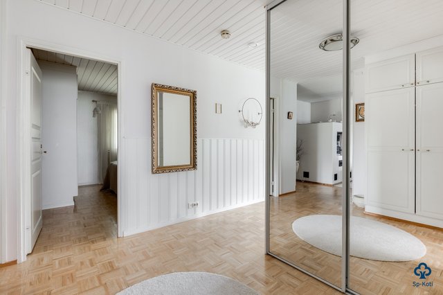 - Pääsisäänkäynnin eteinen: Lattia / laatta, seinät / tapetti ja puolipaneeli Käytävä: Lattia / parketti, seinät / maali Toinen eteinen: Lattia / laatta, seinät / tapetti ja puolipaneeli