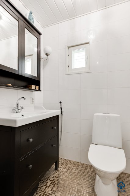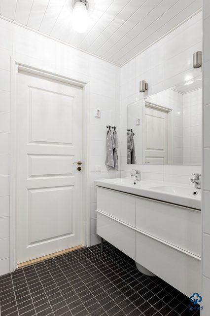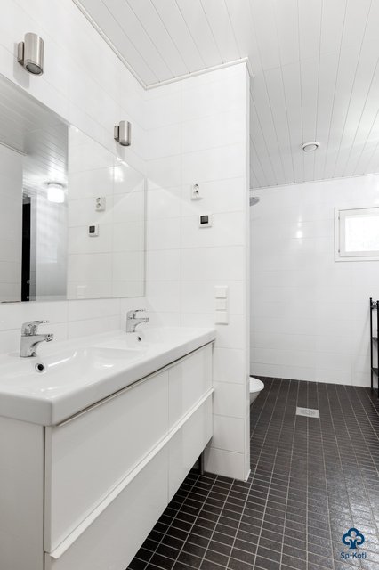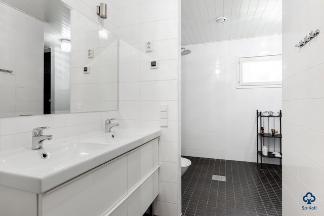 - WC-istuin, suihku, pesukoneliitäntä, lattialämmitys, peili, allaskaappi, ja kaksoispesuallas