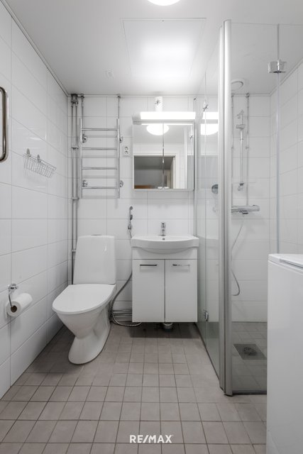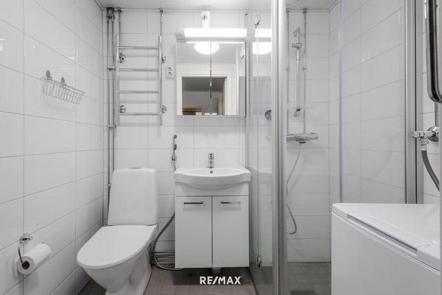 - WC-istuin, suihku, suihkuseinä, pesukoneliitäntä, peilikaappi, pesuallas, allaskaappi, ja bidee-suihku