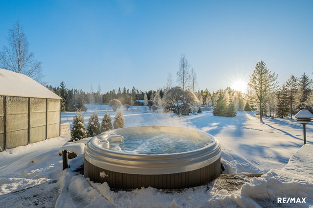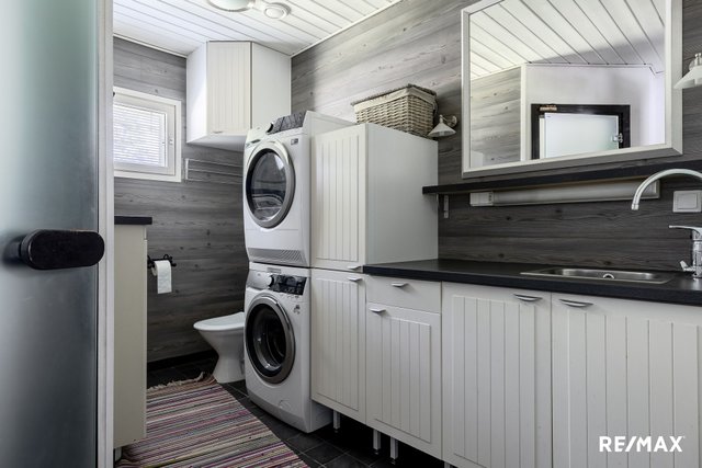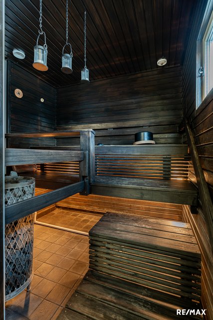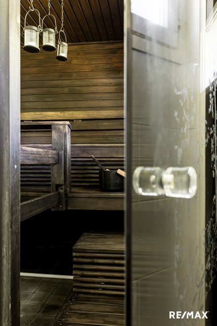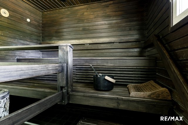 Makuuhuoneita on kolme ja säilytystilaa löytyy kivasti. Omasta saunasta on mukava siirtyä terassille tai ulkoporeammeeseen. Talossa on kaksi wc:tä, toinen löytyy erillisestä tilasta ja toinen hyvän kokoisesta kodinhoitohuoneesta.