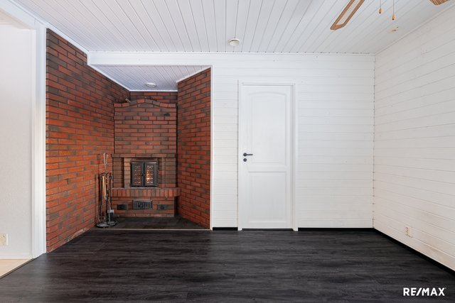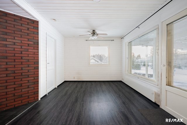 - Tapetti, märkätilassa laatta, takkahuoneessa puupaneeli. Kodinhoitohuoneessa laminaatti, osin rappaus.