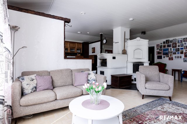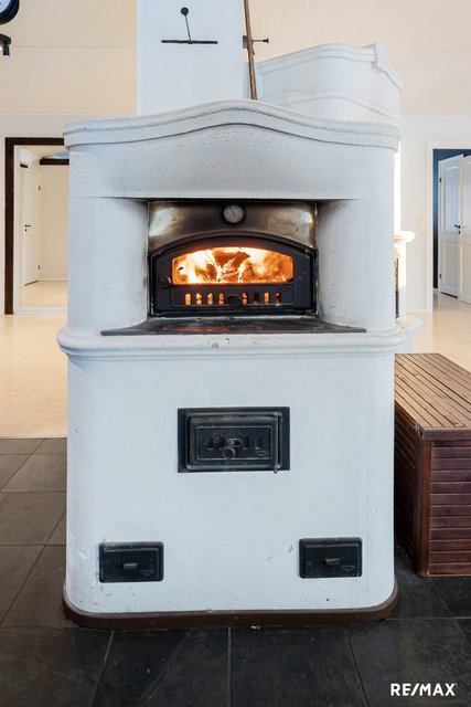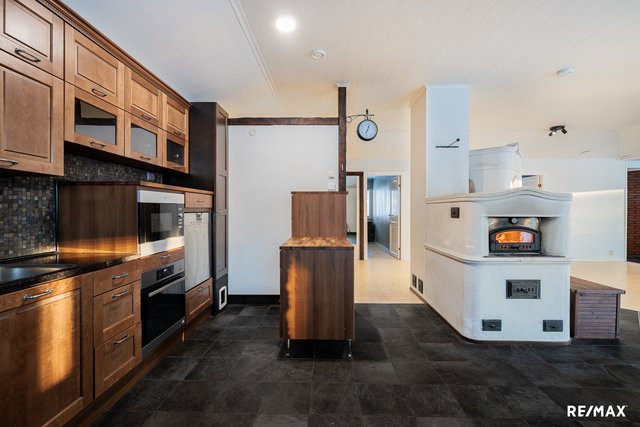 Olohuone ja keittiö ovat lähes avonaista tilaa ja kodin sydämenä toimii varaava leivinuuni/takka. Keittiöstä löytyy mukavasti tilaa ja varustuksena muun muassa täyskorkeat jääkaappi ja pakastin sekä viinikaappi. Osa keittiön tasoista on tyylikästä kiveä.