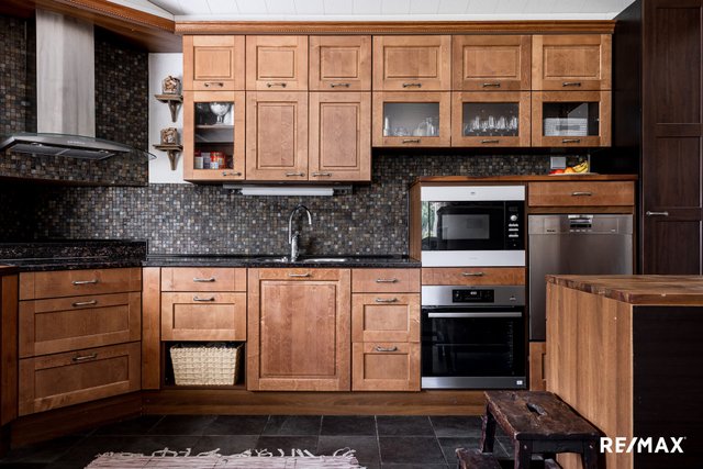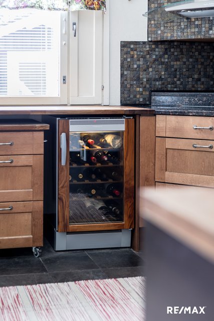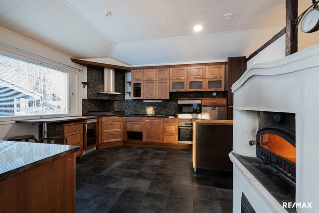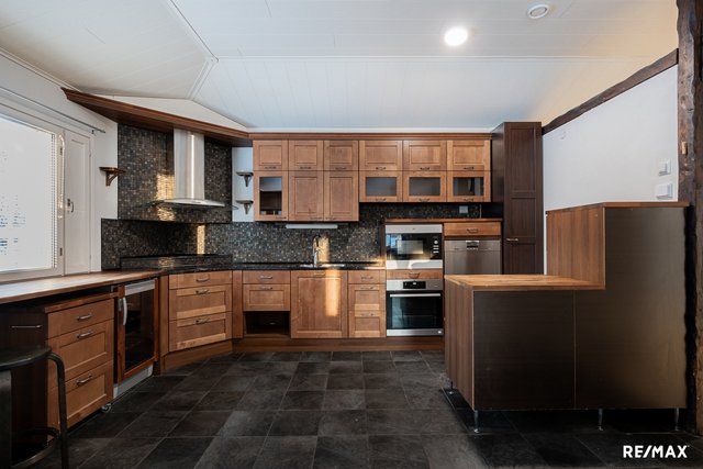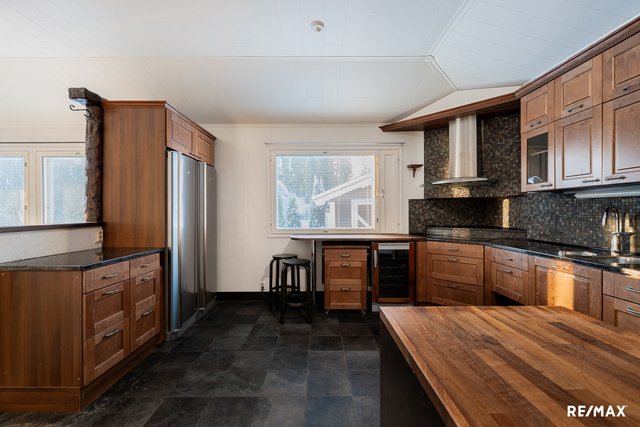 - Leivinuuni, jääkaappi, pakastin, keraaminen liesi, kiertoilmauuni, integroitu mikro, astianpesukone, liesituuletin hormilla, viinikaappi, osin kivitasot.