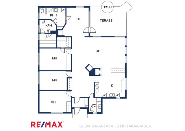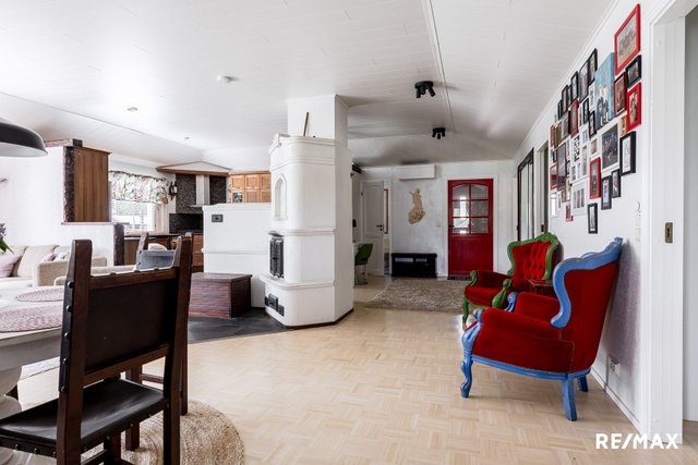 - Olohuone yhdistyy mukavasti keittiöön. Kaksi varaavaa takkaa.