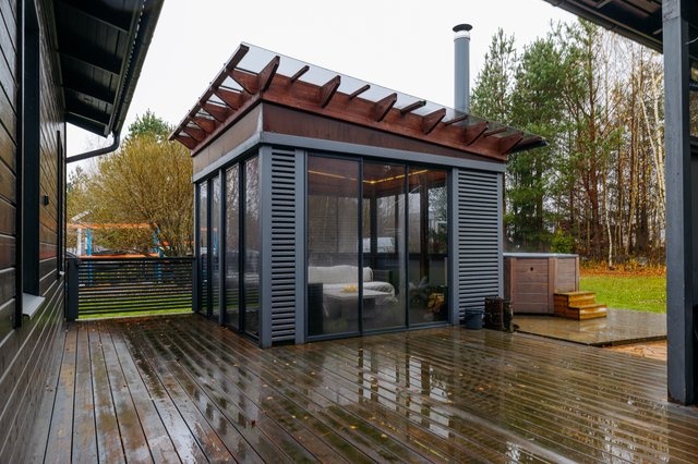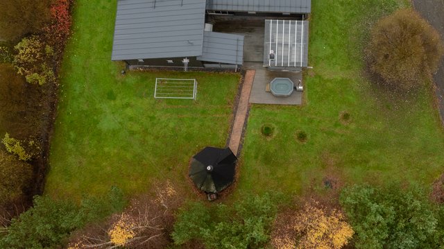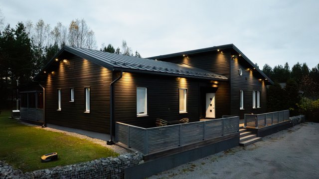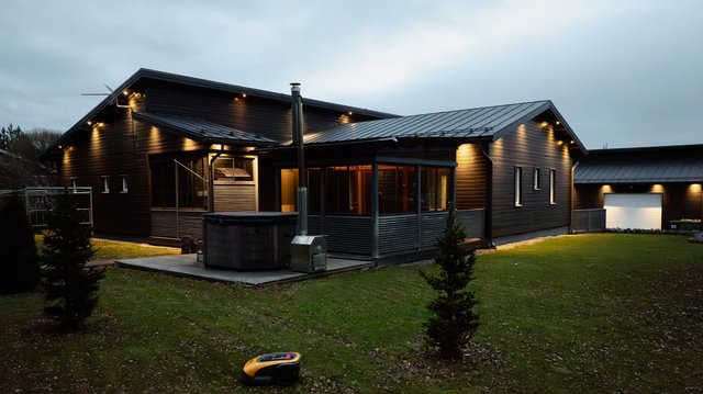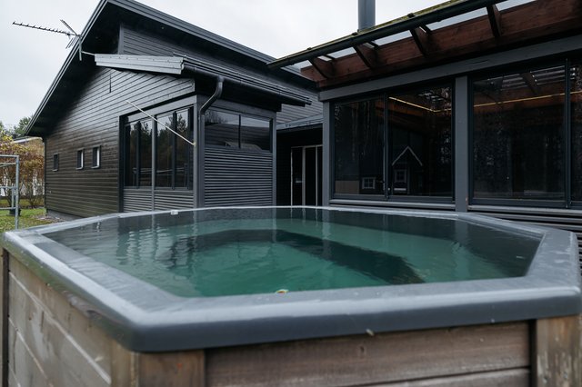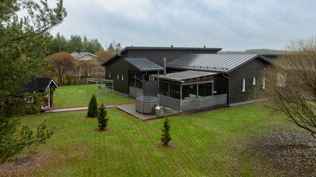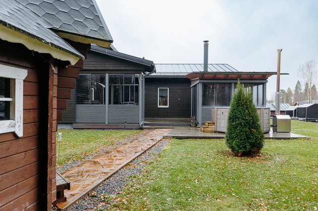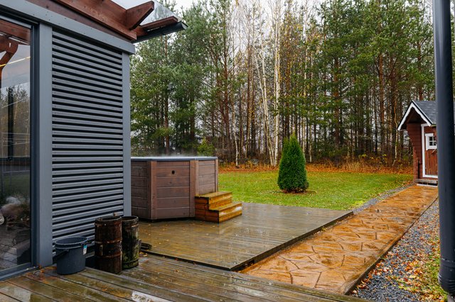 Ulkoalueet ovat yhtä vaikuttavat kuin sisätilatkin. Suuri 2400 m² tontti tarjoaa runsaasti tilaa ulkoiluun ja rentoutumiseen. Pihasauna, palju ja terassi kutsuvat nauttimaan kesäpäivistä perheen ja ystävien kanssa.