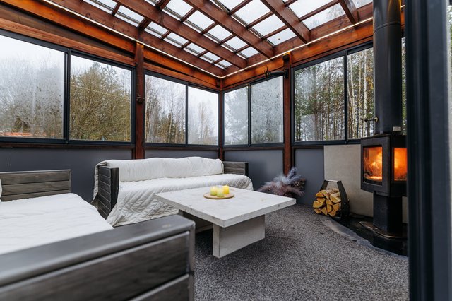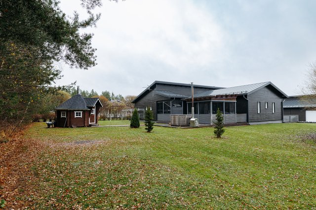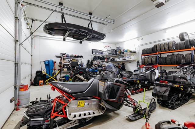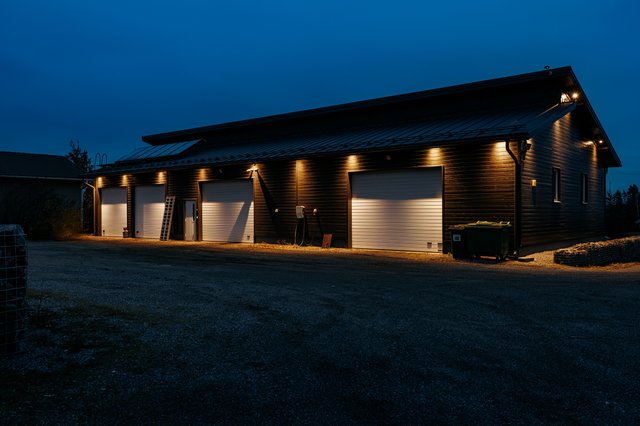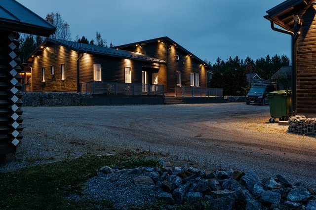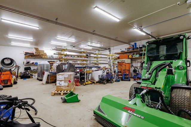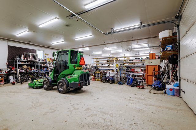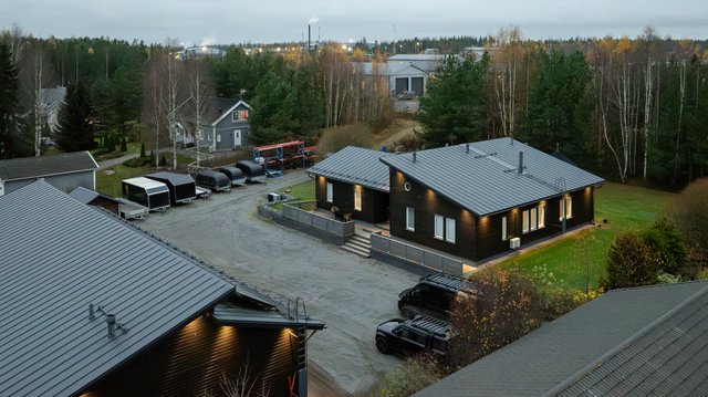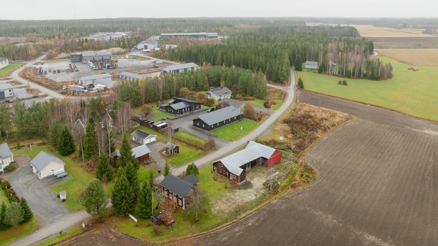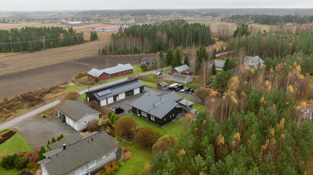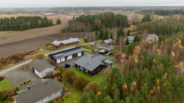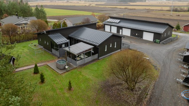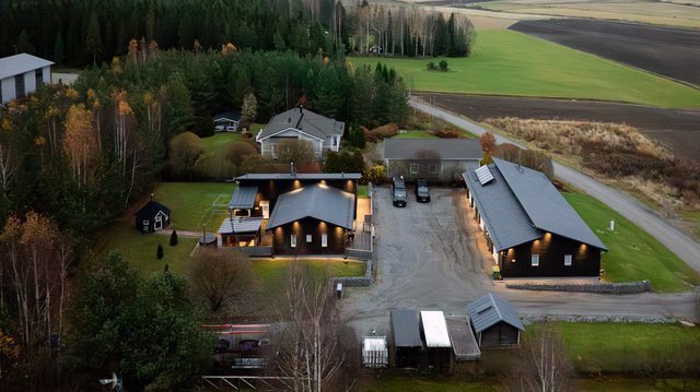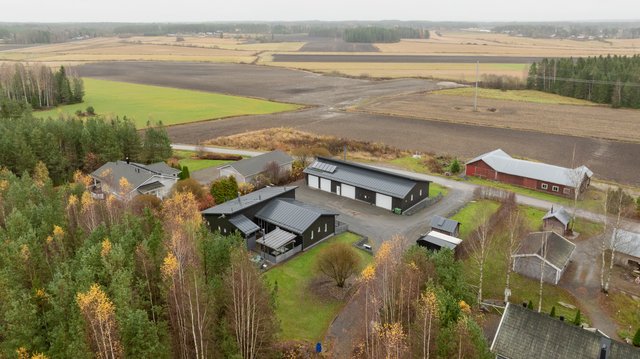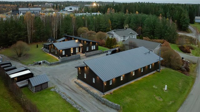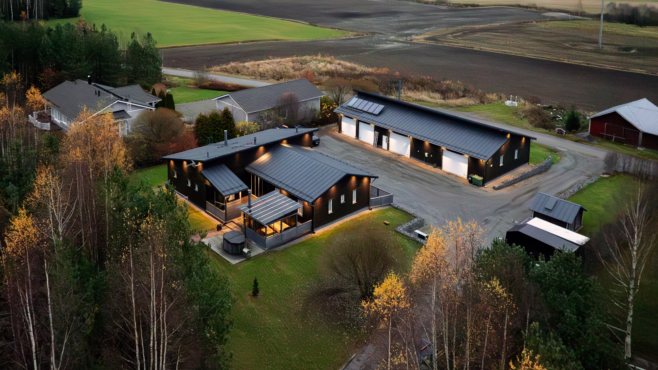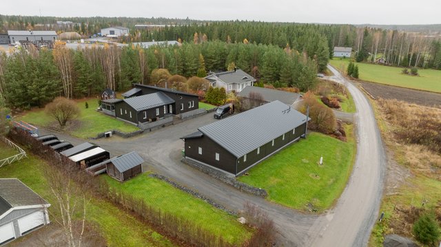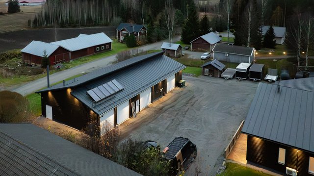 292m2 hallirakennus korkeilla nosto-ovilla ja tarjoaa loistavat puitteet monenlaiseen toimintaan. Molempien rakennusten lämmitysjärjestelmänä toimii energiatehokas maalämpö, jota tukee lisäksi puukeskuskattila ja aurinkokeräimet.