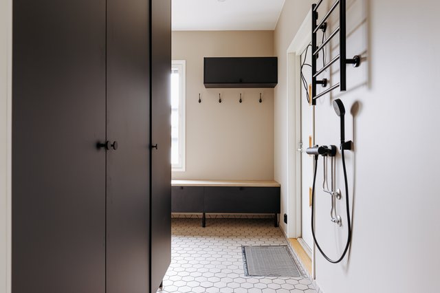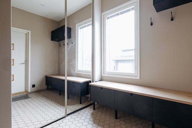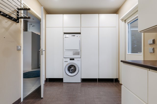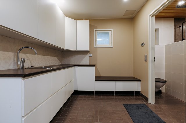 - Lattialämmitys, lattiakaivo, pesuallas, pöytätaso, pyykkikaapit, ja pesukoneliitäntä