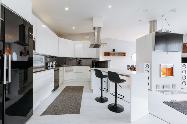 - Jääkaappi, erillinen pakastin, liesituuletin, liesi, mikroaaltouuni, astianpesukone, keittiösaareke, ja erillisuuni