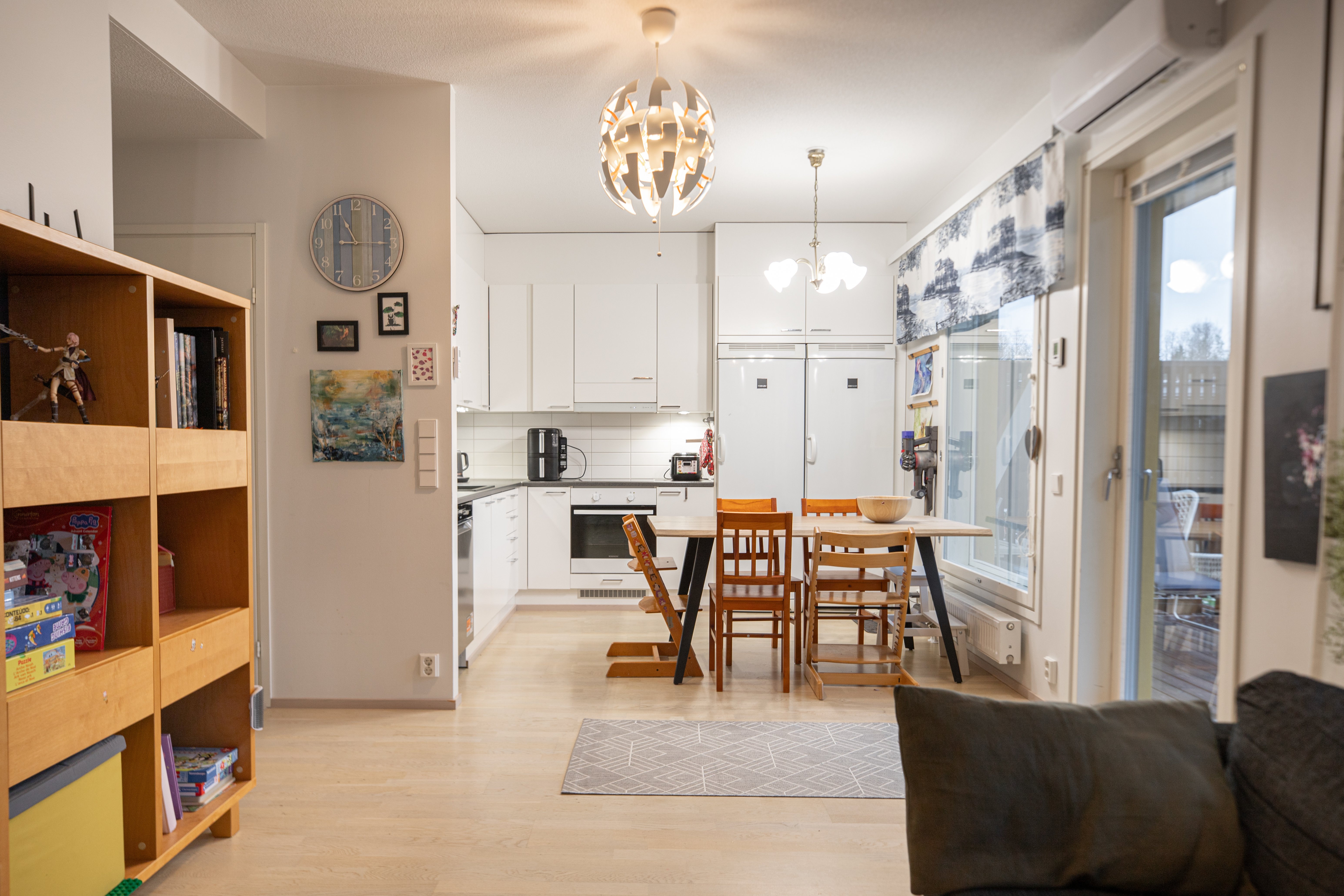 Tässä kodissa tilat ovat käytännöllisesti yhdessä tasossa, kaikki neliöt on saatu hyvin käytettyä, ja näin asunto tuntuukin neliöitään selvästi isommalta. Arjen sujuvuutta ja mukavuutta lisää oma sauna, kaksi wc:tä, vaatehuone ja viilennystä lämpimiin kesäpäiviin antava ilmalämpöpumppu.
