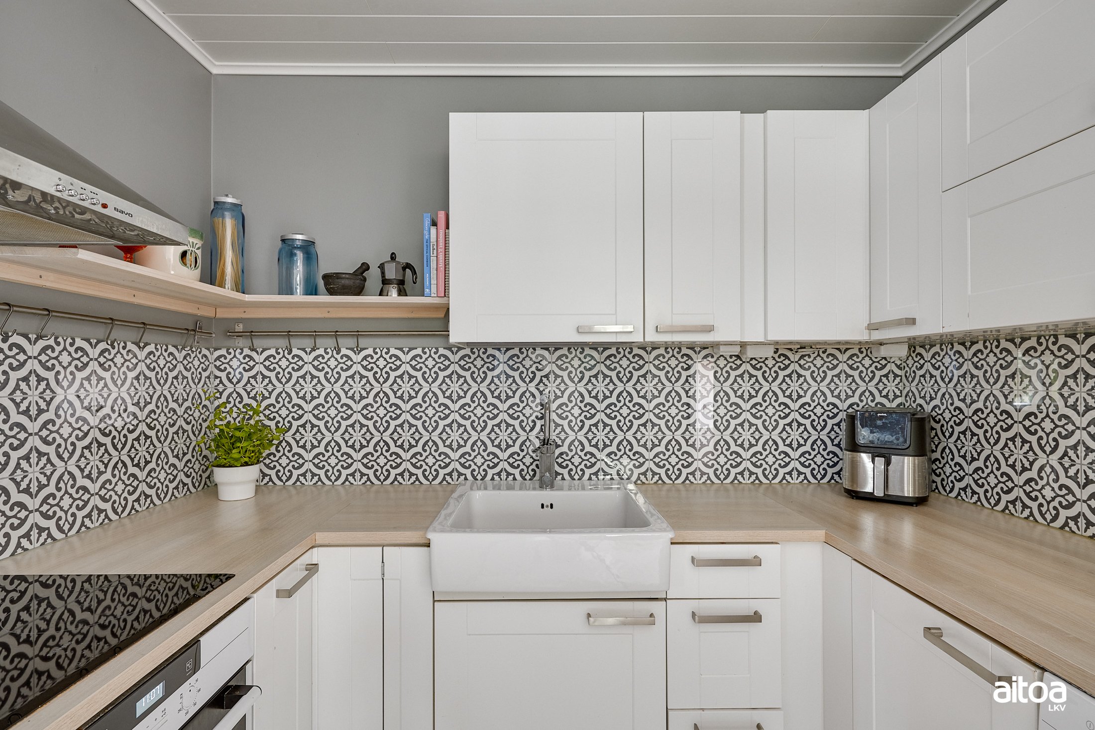 Asunnon pohjaratkaisu on toimiva ja tilava. Alakerrassa on olohuone, jossa parkettilattia kätkee alleen kauniin lautalattian. Keittiö on varusteltu nykyaikaisesti, ja erillinen wc tuo arkeen käytännöllisyyttä. Yläkerrassa sijaitsevat makuuhuoneet, joissa lautalattiat ja maalatut seinät luovat rauhallisen tunnelman.