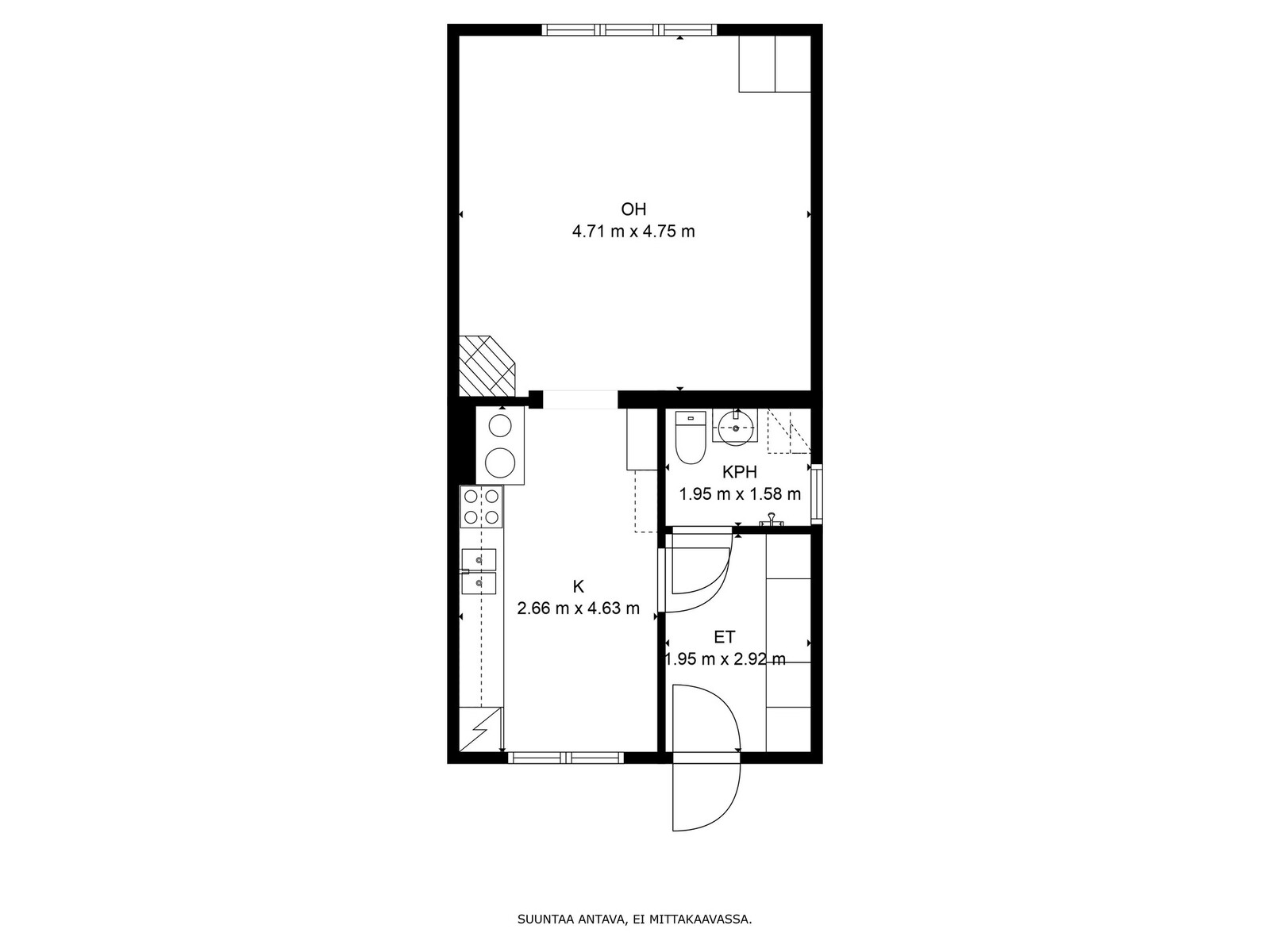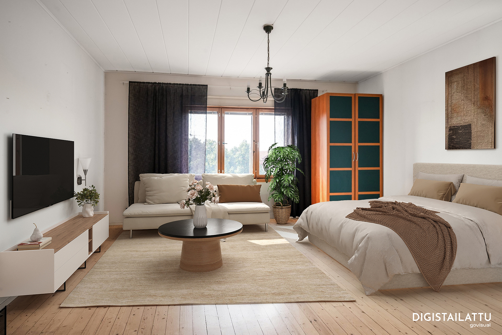 Olohuone/makuuhuone on ihanan valoisa ja muuntautumiskykyinen – sinne mahtuu mainiosti sekä sänky että olohuonekalustus. Huoneen katseenvangitsijana toimii kaunis kakluuni, joka luo tilaan arvokkuutta ja lämmittää talvi-iltoina. Ikkunoista avautuu näkymä kaupungin elämään: sijainti suuren tien varrella tarjoaa ainutlaatuisen mahdollisuuden seurata urbaania vilinää, mutta liikenteen äänet eivät juuri kantaudu sisälle.