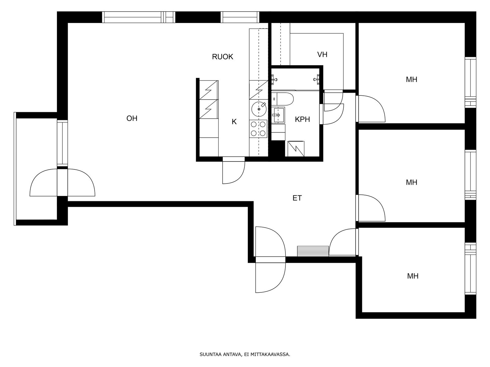 Ikkunat ja ovet ovat välttävässä kunnossa. Ikkunoiden ja ovien kunnostukseen on varauduttava arviolta 10 vuoden sisällä.