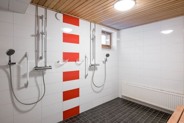 - Tilava kylpyhuone, jossa on paikka pyykinpesukoneelle. Varusteina wc-istuin, allas/allaskaappi, peilikaappi, bidee-suihku, suihku, suihkukaappi ja pesukoneliitäntä.