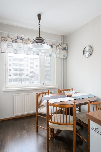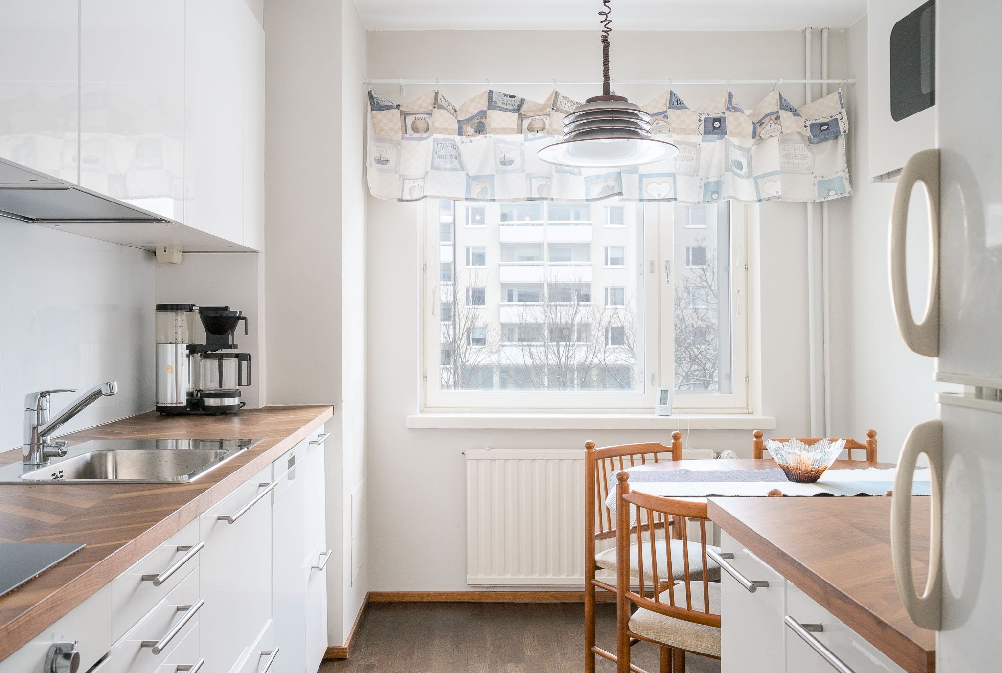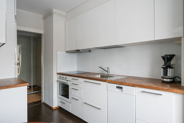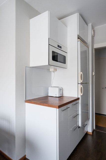 - Kompakti vaaleasävyinen keittiö, jossa on hyvin lasku- ja säilytystilaa. Keittiönkaapit on uusittu vuonna 2022.