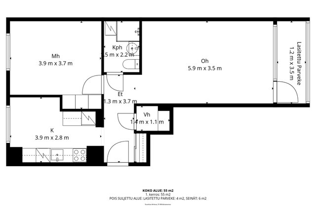 - Vastikeperusteena hoito- ja rahoitusvastikkees on huoneiston pyöristetty jyvitetty pinta-ala 55,1 m2.