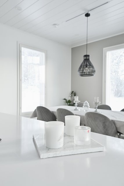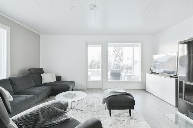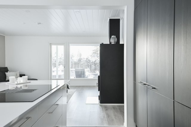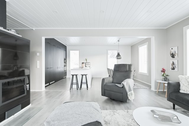 Talon sydän on avara olohuone, jossa on varaava takka ja laadukkaat vinyylilattiat. Keittiö on varustettu huippuluokan kodinkoneilla, kuten AEG:n pyrolyysiuunilla ja integroiduilla Elektroluxin jääkaapilla ja pakastimella. Kvartsitasot ja aamiaiskaappi tekevät keittiöstä sekä käytännöllisen että tyylikkään.