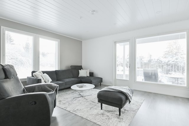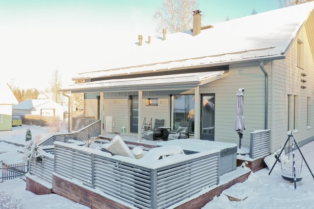 - Rakennusmateriaali: Puu. Pintamateriaalit (seinä) Maali, kosteissa tiloissa laatta. Lattioiden pintamateriaalit: Olohuoneessa ja makuuhuoneissa Ideo Pro 33 vinyylilankku. Laudan pohjassa on integroitu kopinanvaimennus(19dB), joka tekee lattiasta miellyttävän ja äänettömän.