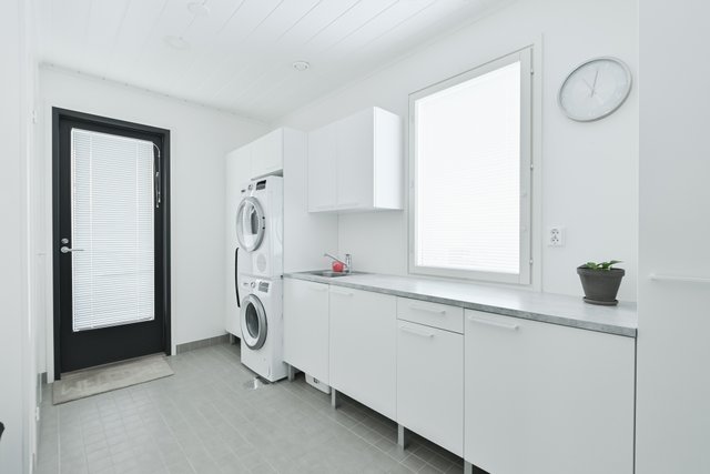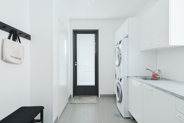 - Pesukone, kuivausrumpu, pesukoneliitäntä, lattialämmitys, pesuallas, lattiakaivo, ja pöytätaso