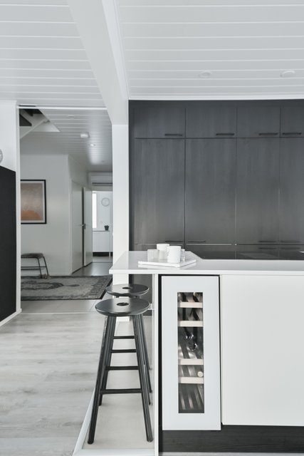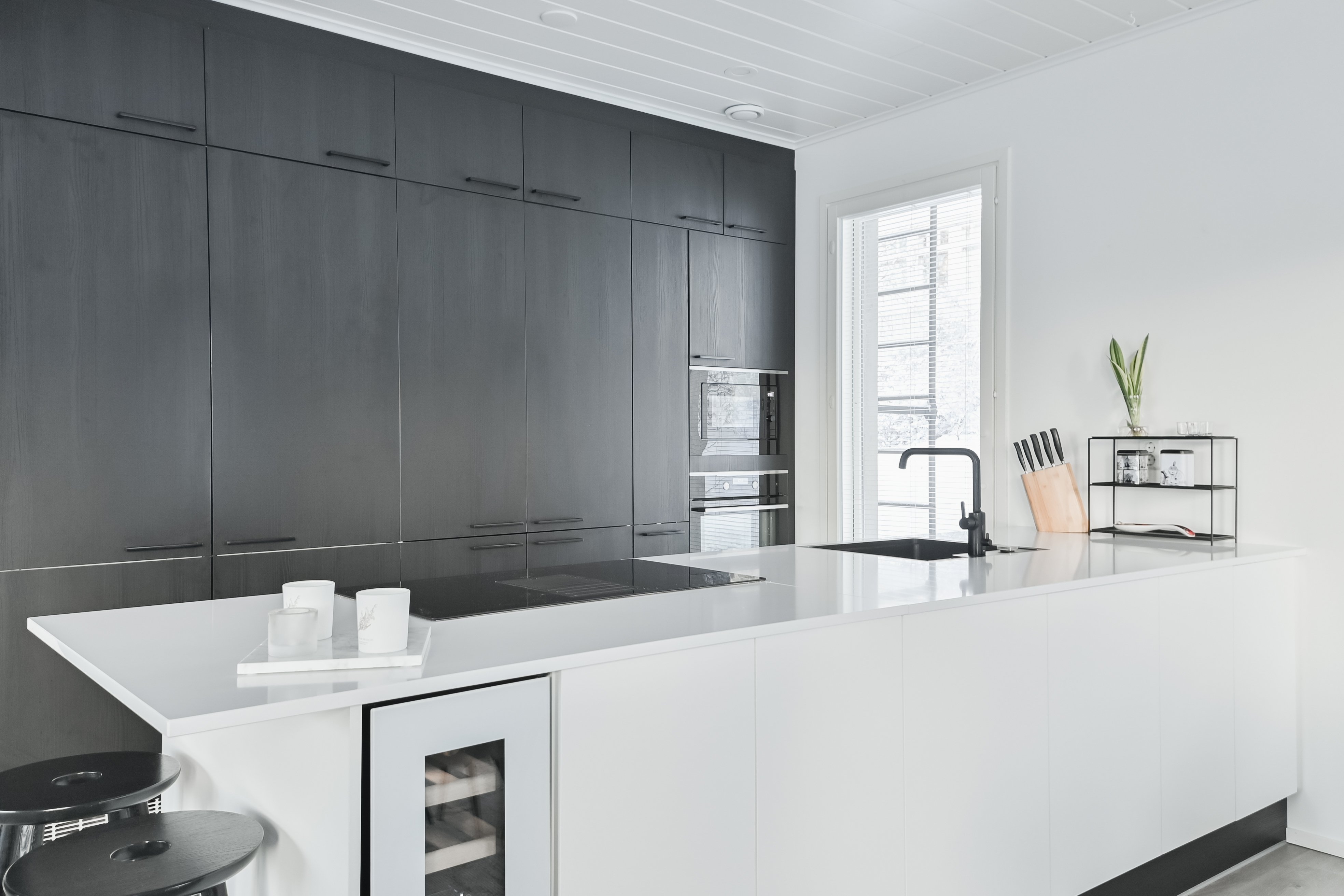 - Keittiössä kvartsitasot, AEG pyrolyysiuuni, mikroaaltouuni, erillinen induktioliesitaso liesituulettimella, täyskorkeat intergroidut Electroluxin jääkaappi ja pakastin. Temtech viinikaappi, intergroitu astianpesukone.