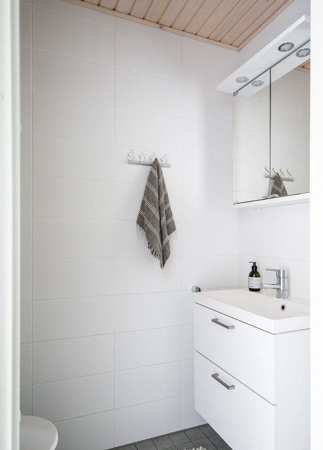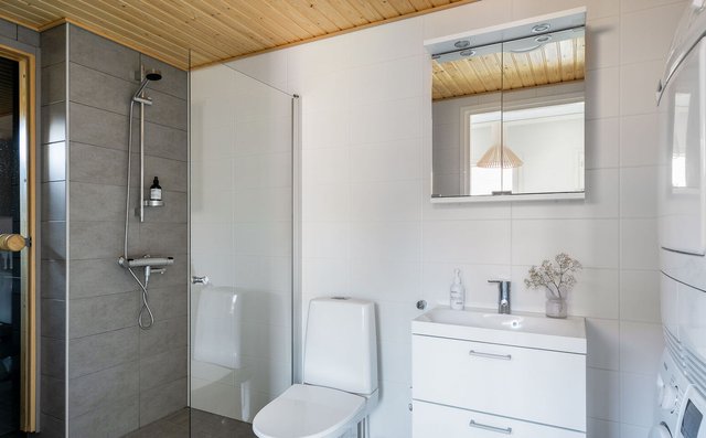 - Suihku, wc-istuin, pesukoneliitäntä, lattialämmitys, peilikaappi, allaskaappi, ja pesuallas