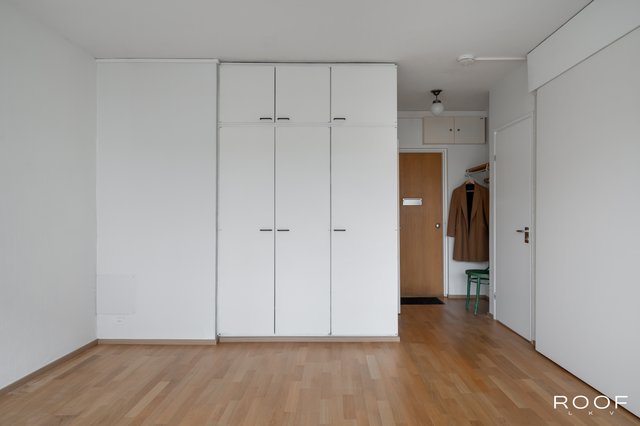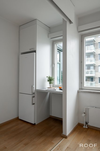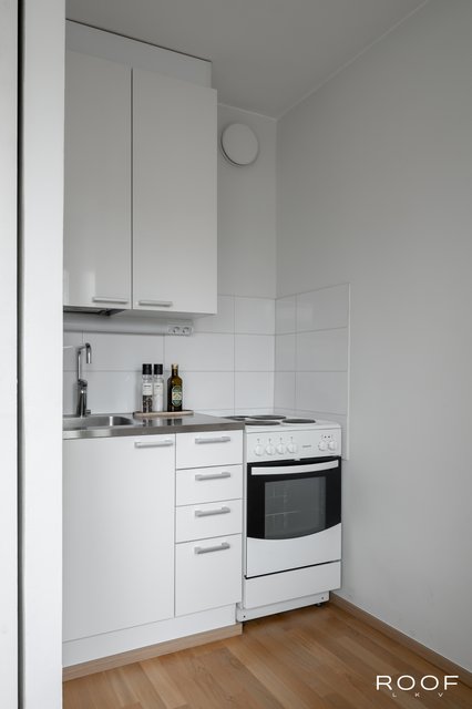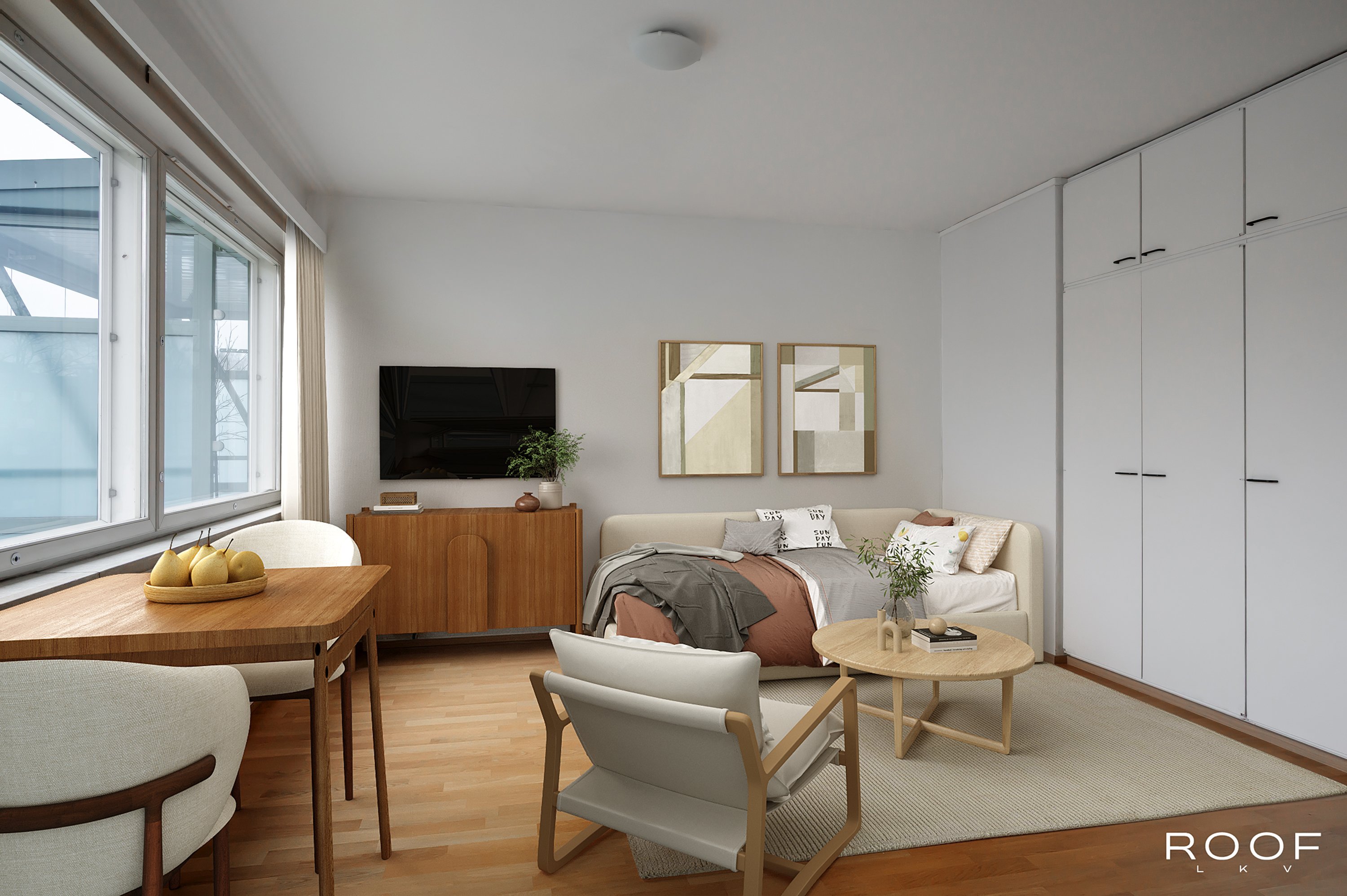 Tämä ylimmän kerroksen tilaihme tuntuu todellakin neliöitään suuremmalta ja tarjoaa tyylikkään, valoisan ja toimivan kodin joko omaksi tai sijoitukseen. 25 neliön selkeä ja käytännöllinen pohjaratkaisu tekee arjesta sujuvaa. Sängylle, sohvalle ja pöydälle löytyy luontevat paikat, ja keittiöön mahtuu mukavasti myös ruokapöytä.