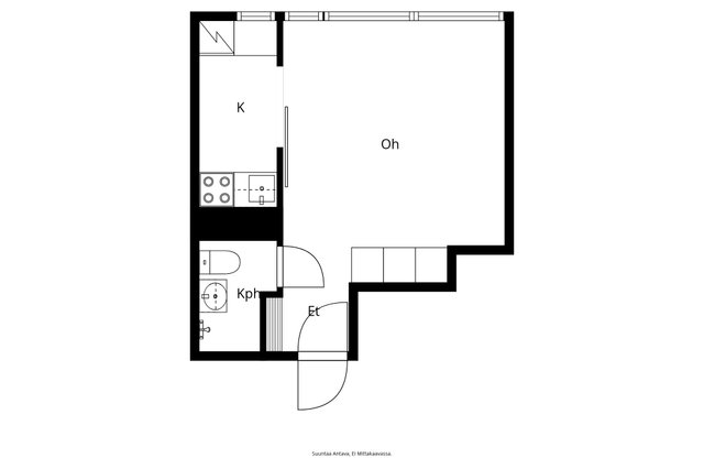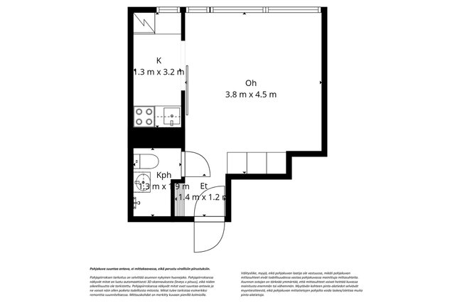 - Huoneiston pinta-ala on yhtiöjärjestyksen, isännöitsijäntodistuksen ja myyjän ilmoituksen mukaan 25 m2. Pinta-alaa ei ole tarkistusmitattu. Edellä mainittu pinta-ala saattaa tämän ikäisessä kohteessa poiketa olennaisestikin huoneiston nykyisen ja rakentamisaikaisen mittaustapojen ja standardien mukaan laskettavasta pinta-alasta. Huoneiston todellinen pinta-ala voi siis olla yhtiöjärjestyksessä, isännöitsijäntodistuksessa ja esitteessä mainittua pienempi tai suurempi.