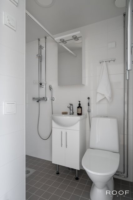 - WC-istuin, suihku, pesukoneliitäntä, allaskaappi, ja pesuallas