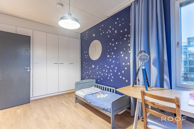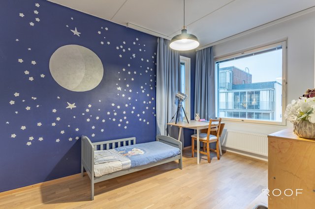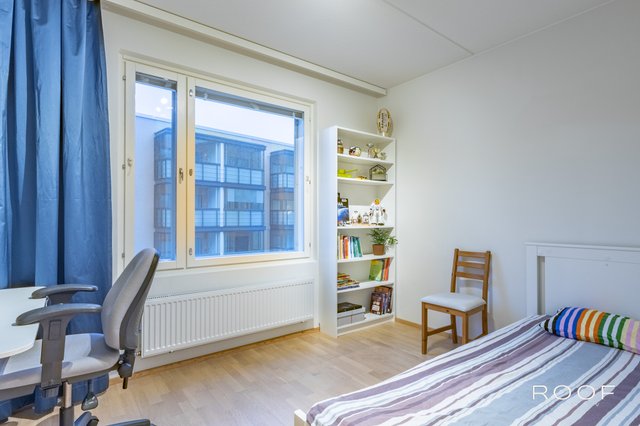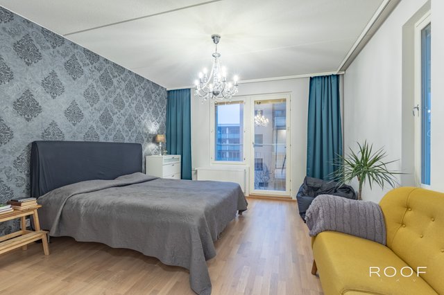 Asunnon ehdoton helmi on suurin makuuhuone, jolla on oma sisäänkäynti eteisestä sekä oma kylpyhuone. Tämä tarjoaa poikkeuksellista joustavuutta: tila toimii loistavasti päämakuuhuoneena, mutta myös esimerkiksi perheen teinille omana rauhallisena “yksiönä” tai vaikkapa etätyöskentelyyn.