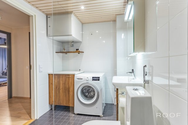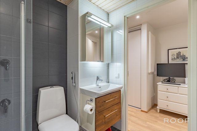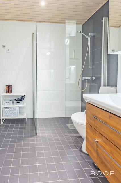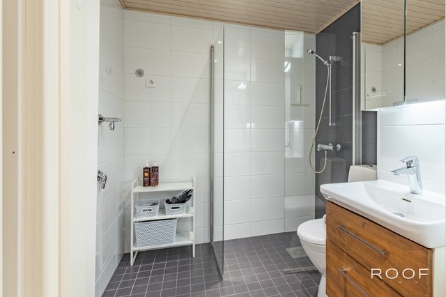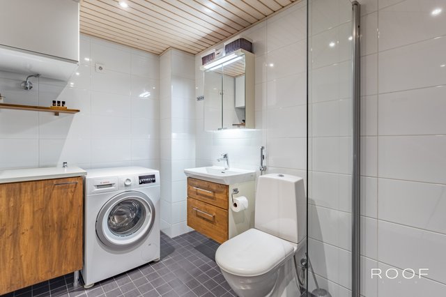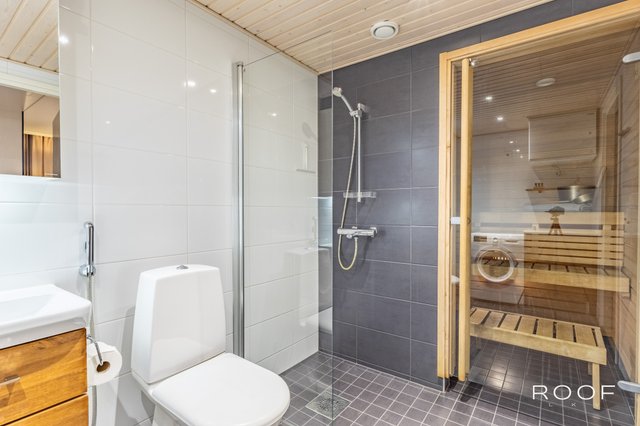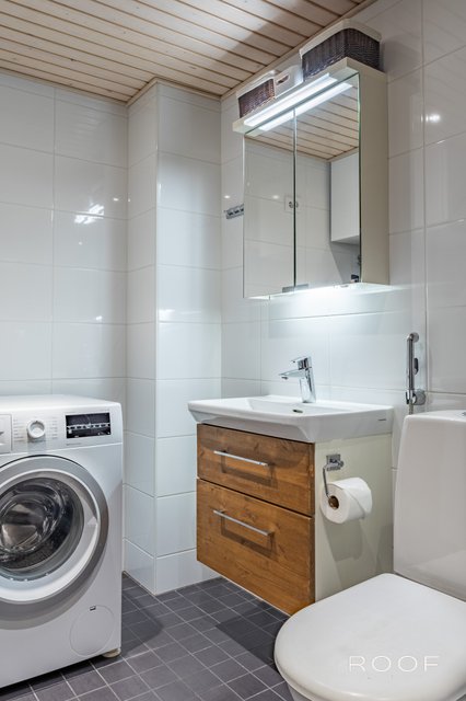 - WC-istuin, suihku, pesukoneliitäntä, peilikaappi, allaskaappi, pesuallas, suihkuseinä, lattialämmitys, ja pyykkikorikaappi