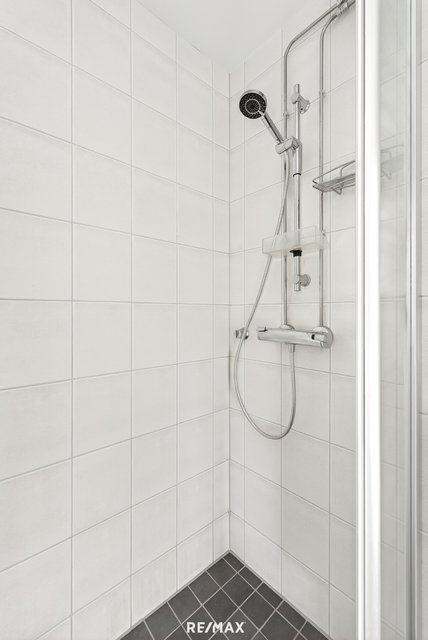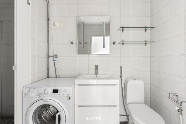 - Kylpyhuoneessa wc-istuin, suihku, suihkuseinä, pesukoneliitäntä, peili, pesuallas, allaskaappi, bidee-suihku, säilytyskaappi, seinäpatteri. Laattalattia ja kaakeliseinät.