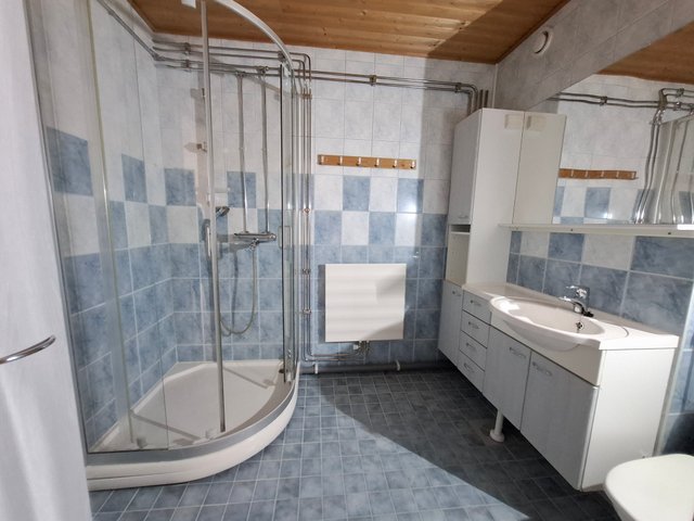 - Suihkukaappi, allaskaappi, pesukoneliitäntä, wc-istuin, suihku, peili, pesuallas, ja bidee-suihku