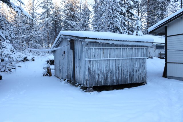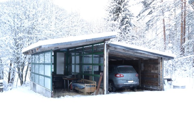 - Autokatos kahdelle autolle, aitta/varasto, puuliiteri ja varasto.