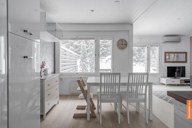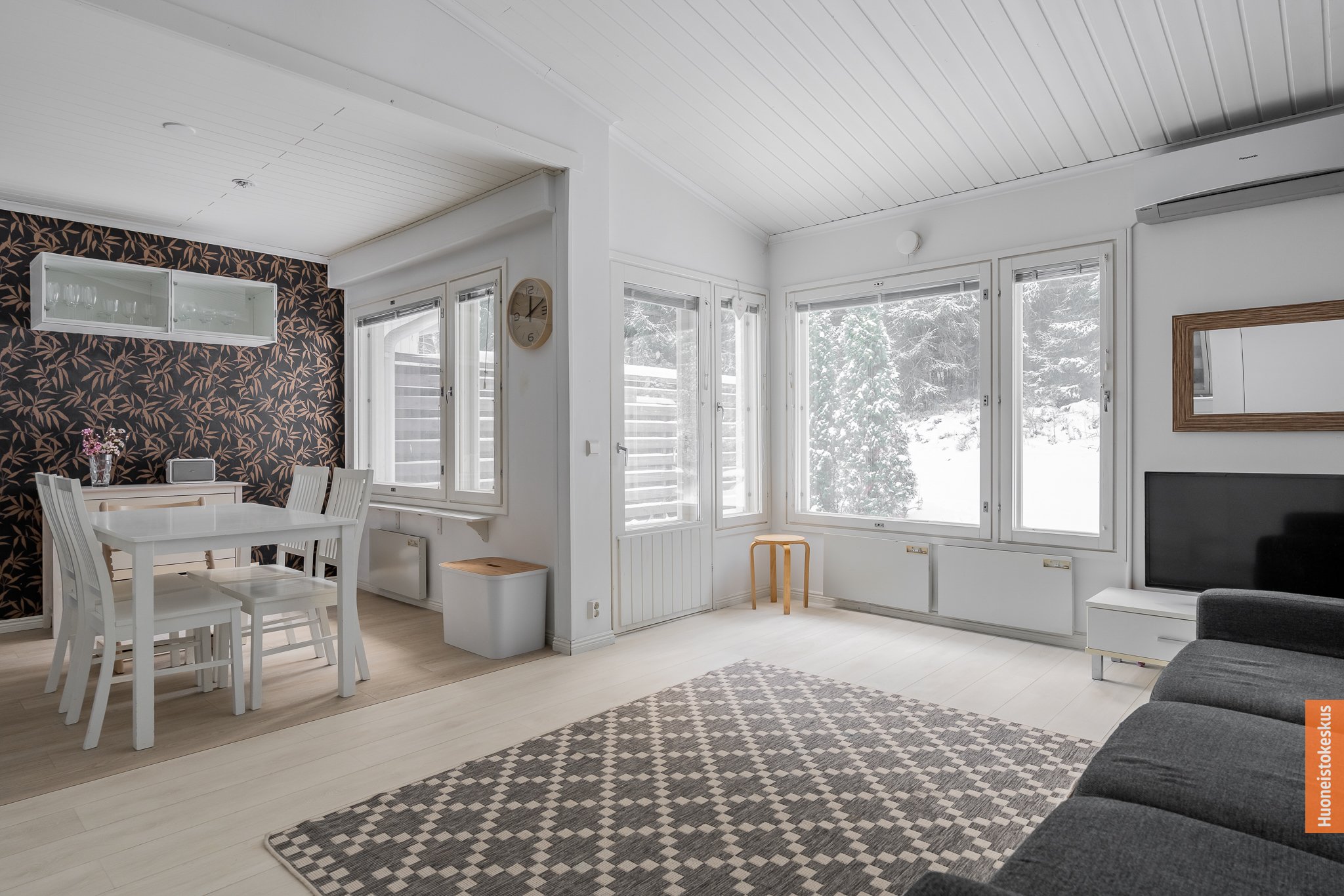 Kolmikerroksinen koti tarjoaa tilavat ja valoisat huoneet, joissa on korkeat katot, tuoden avaruutta ja ilmavuutta asumiseen. Keittiö, ruokailutila ja olohuone ovat samaa avaraa valoisaa tilaa. Keittiö on varustettu suurimmaksi osaksi laadukkailla Boschin kodinkoneilla, ja sen lattia on uusittu vuonna 2025. Asunnossa on kaksi makuuhuonetta, jotka sijaitsevat erikerroksissa tuoden omaa rauhaa molempiin makuhuoneisiin. Toisessa makuuhuoneessa on oma vaatehuone, mutta toisen vieressä on kaksi vaatehuonetta. Joten säilytystilaa on hyvin kaapistojen ja ulkovaraston lisäksi. Portaikko on loppuvuodesta saanut uuden maalipinnan, tuoden raikkaan ilmeen tilaan. Kylpyhuoneen perällä on tilaa kodinhoitoon ja erillisen vessan lisäksi kylpyhuoneessa on wc-tilat. Omalta suojaisalta takapihalta lähtee suoraan metsäiset lenkkipolut.