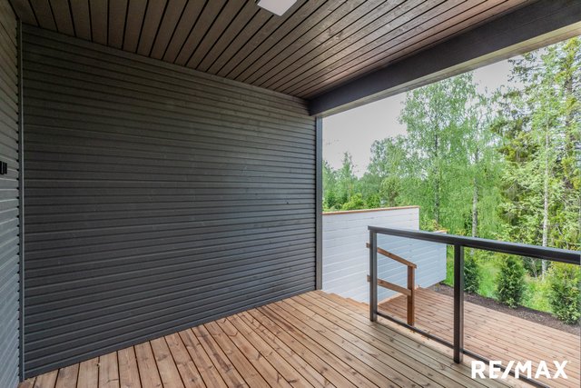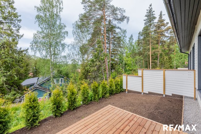 Olohuoneesta avautuvat kauniit näkymät vehreään ympäristöön, ja terassi tarjoaa mukavan paikan nauttia ulkoilmasta. Sauna on varustettu Harvian tornikiukaalla ja lasiseinällä. Sadesuihku kylpyhuoneessa tietenkin.