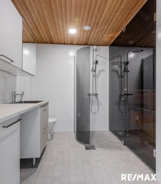 - Sisäkatto lepänsävyinen Sts mäntypaneli Katossa Led-valaistus Sadesuihku ja suihkuseinä Kalusteet Puustelli WC-istuin Gustavsberg Pesuallas ja allaskaappi