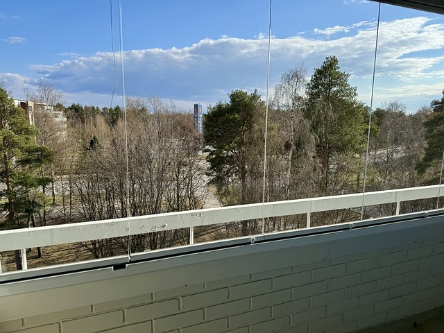 Lasitettu tilava parveke. Parvekkeelta avautuvat rauhalliset näkymät, eikä yläpuolella ole naapureita – täällä asut omassa rauhassasi.