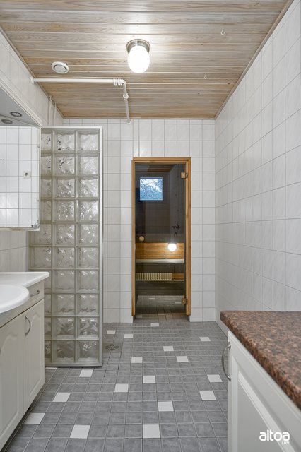 - Suihku, suihkuseinä, pesukoneliitäntä, peilikaappi, pesuallas, ja allaskaappi