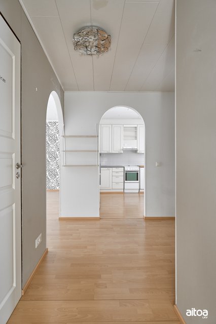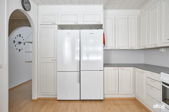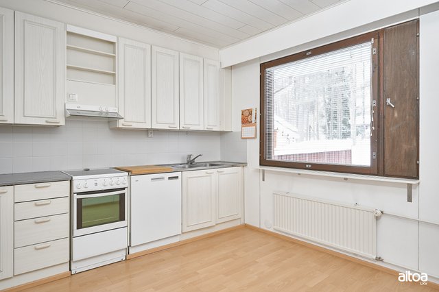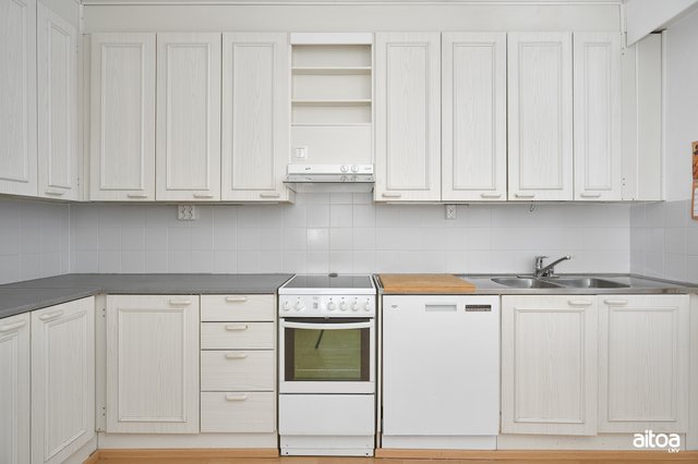 - Täyskorkeat jääkaappi sekä pakastin, keraaminen liesi, liesituuletin, astianpesukone. Laminaattilattia.