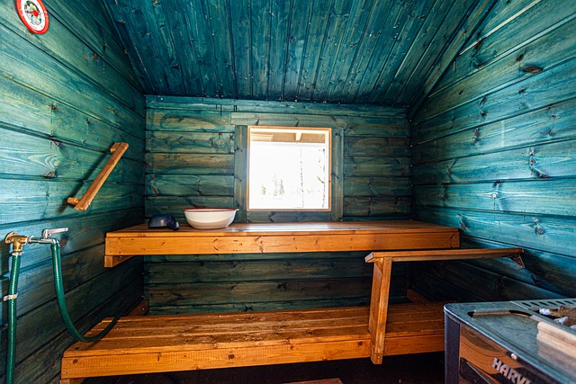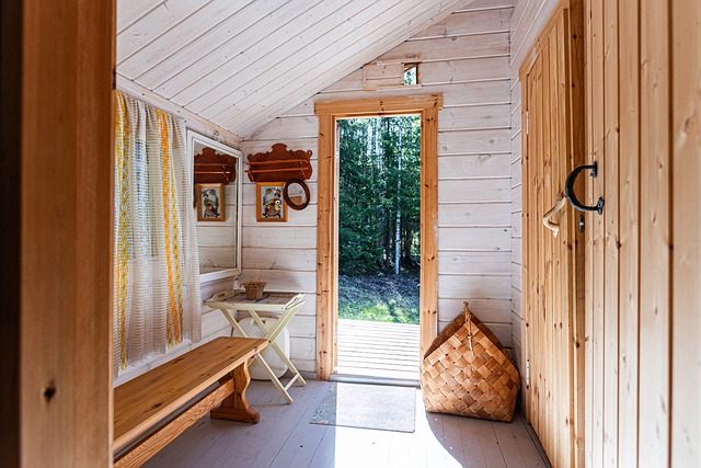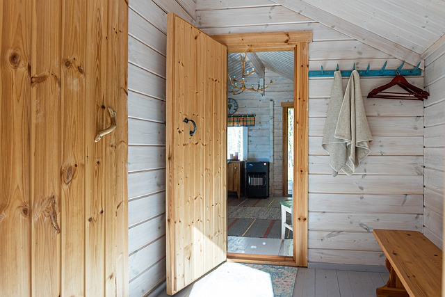 - Pukuhuoneen lattiassa maalattu lauta, seinät hirsi ja paneelipinnalla, katossa paneeli.