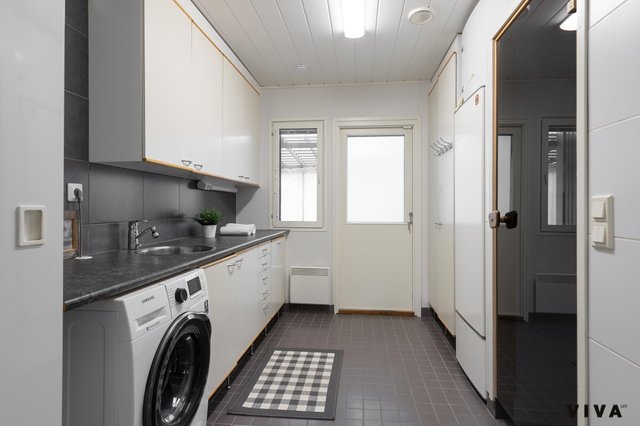 - Lattialämmitys, pesukoneliitäntä, lattiakaivo, pöytätaso, ja tila pesutornille