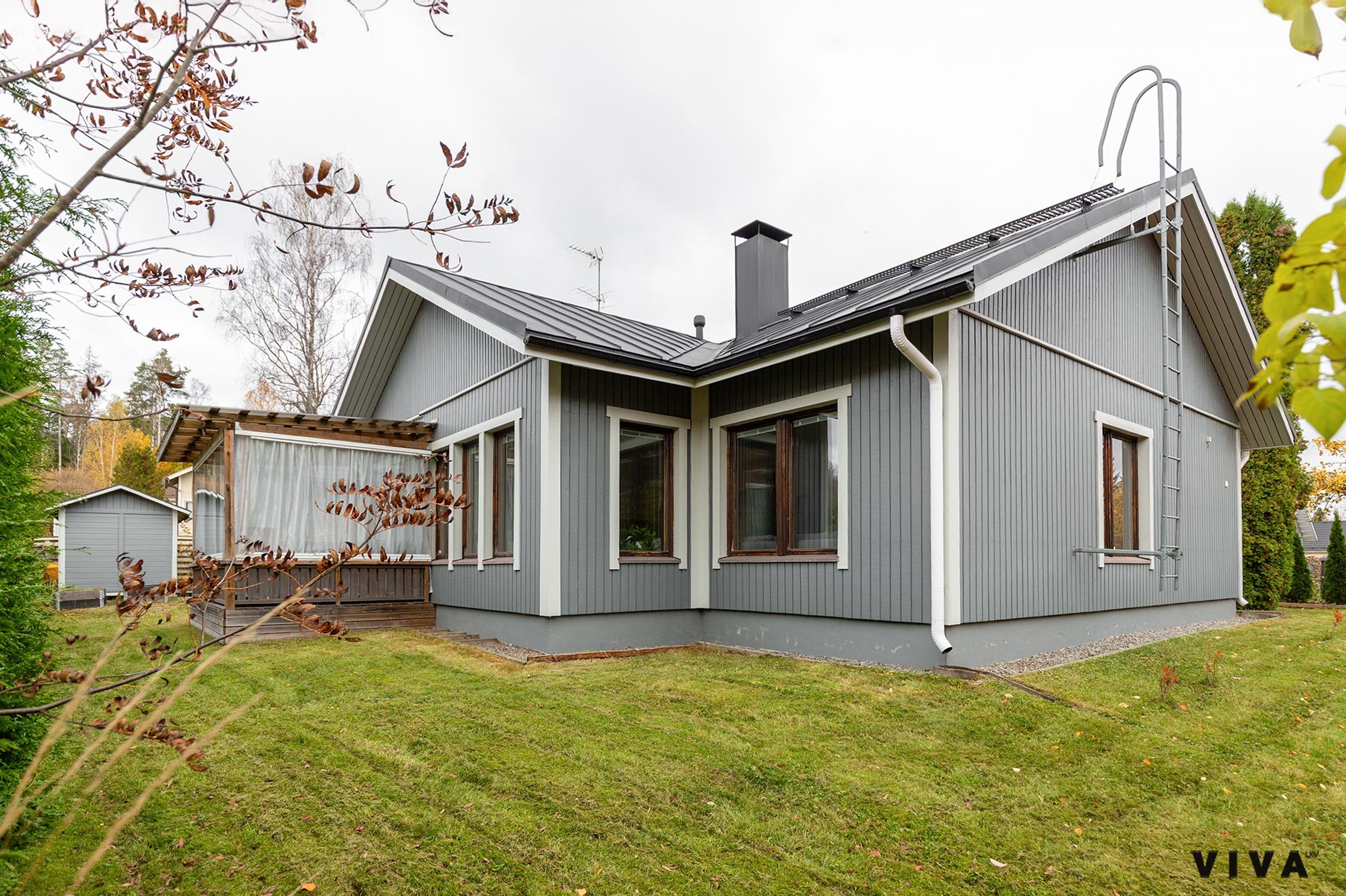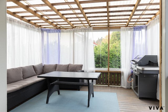 Iso lasitettu terassi tuo keväällä ja syksyllä mukavasti lisää terassin käyttöaikaa. n.50m2 lämmin autotalli kruunaa