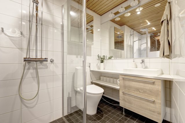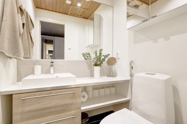 - Suihku (x2), wc-istuin, suihkuseinä, lattialämmitys, pesuallas, peilikaappi, peili, allaskaappi, ja bidee-suihku