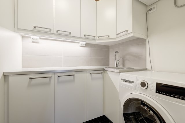 - Lattialämmitys, pesukoneliitäntä, lattiakaivo, pyykkikaapit, pöytätaso, ja tila pesutornille