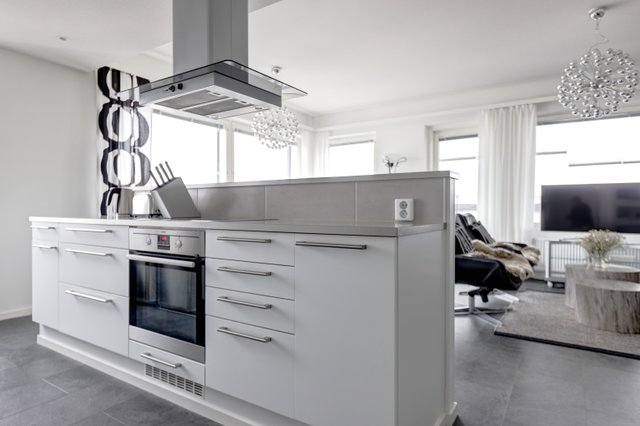 - Jääkaappi, erillinen pakastin, astianpesukone, erillisuuni, liesi, ja liesituuletin (Liitetty huoneistokohtaiseen ilmanvaihtoon)