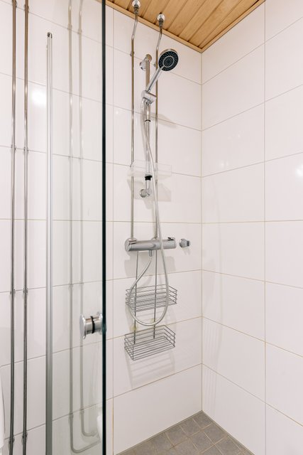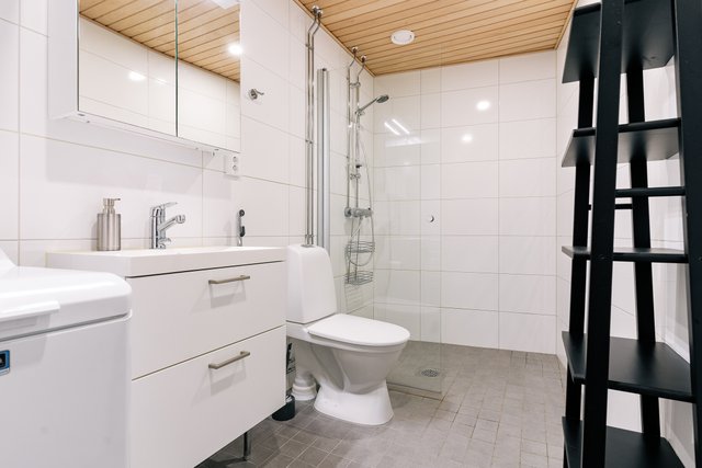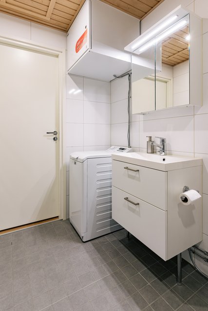 - WC-istuin, suihku, lattialämmitys, peilikaappi, allaskaappi, bidee-suihku, ja pesukoneliitäntä